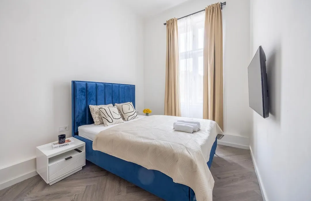 Among the self-catering amenities provided is a fully equipped kitchen with an electric kettle, a refrigerator, and kitchenware. The nearest airport is Budapest Ferenc Liszt International, 25 km from the accommodation, and Opera M bus station is merely a 10-minute walk away.